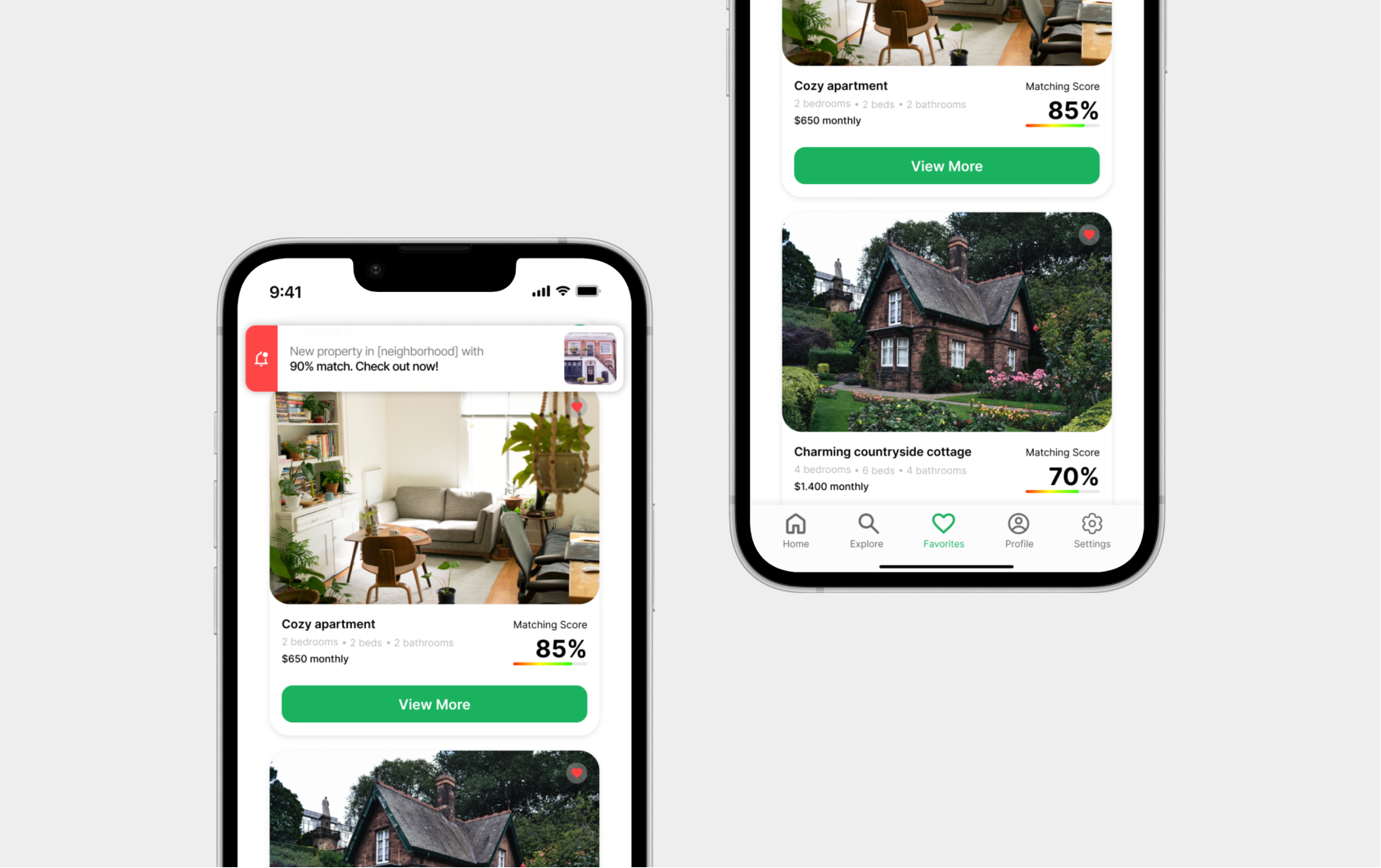 Mobile rental app — smart recommendations, transparent Match Score, proactive notifications.